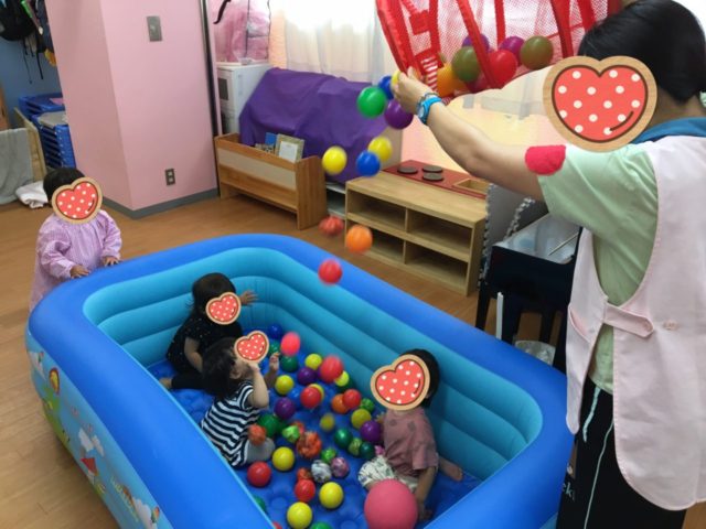 大きなプールに入り、上からボールを落としてもらうと「キャー!」と大喜びの子どもたちでした✨